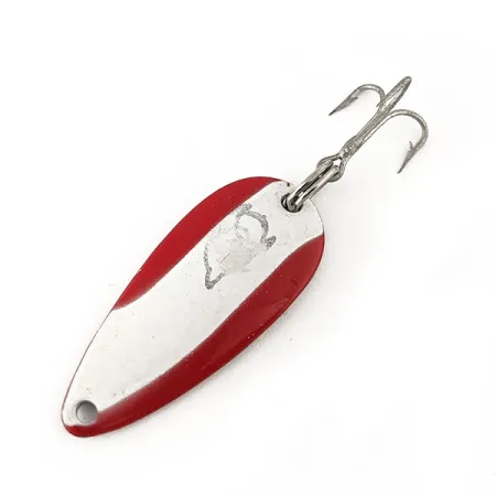 Weighing in at a nimble 3/16 oz (6 g), this Eppinger creation is a classic example of American lure craftsmanship. The 1 1/2" (3.5 cm) metal body features the iconic red and white striped pattern on its face, accented by the distinctive devil head logo stamped into the plating. Flip it over to find the "DARDEVLE MIDGET U.S.A." engraving, a hallmark of its Dearborn, Michigan origins. This specific specimen, identified by product code 11159, remains in excellent condition at a rating of 5/5, showing a bright finish and clean hardware. It comes equipped with a sturdy split ring and a single treble hook. The concave shape of this spoon is the same design that earned Dardevle a spot in WWII aviation survival kits due to its reliability for casting and trolling. While smaller than the traditional Dardevle, the Midget maintains the same construction standards that Lou Eppinger established in 1906.