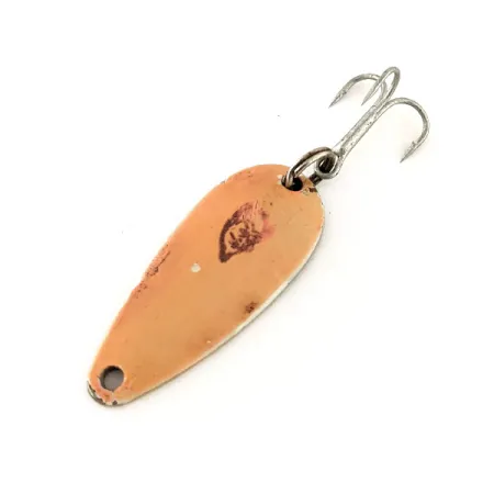 Stamped clearly into the nickel-toned reverse side are the words "DARDEVLE MIDGET U.S.A.," identifying this classic Eppinger spoon. Measuring 1 1/2" (3.5cm), the front of the lure is finished in a warm Salmon paint, featuring the unmistakable black devil head logo centered on the concave body. This 3/16oz (6g) specimen, identified by product code 11724, retains its original hardware, including a strong split ring and a sharp, silver-finished treble hook. The nickel-plated back provides a bright contrast to the colored front, a design choice intended to maximize visibility in various water clarities. Regarding its state, the lure earns a 5/5 rating, showing exceptionally well for a vintage piece with crisp stamping and vibrant paint. These spoons have been produced using proprietary dies since Lou Eppinger founded the company in Detroit back in 1906, eventually moving operations to Dearborn in 1959. Every detail of the construction, from the specific oblong curve to the weight distribution, reflects over a century of American manufacturing specialized for casting and trolling applications.