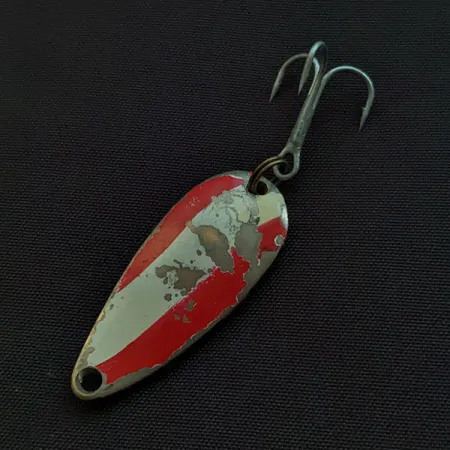 An unmistakable red and white striped pattern characterizes the face of the specimen under code 22035. Measuring exactly 1 1/2" (3.5cm) in length, the lure carries the soul of Eppinger's Detroit beginnings. The "Red Devle" finish on the concave side shows signs of a life well-fished, adding character that many vintage collectors appreciate in an authentic piece. Rated at 4/5, the lure shows typical paint wear from use while the metal remains solid. Stamped clearly on the metallic reverse are the words "DARDEVLE MIDGET U.S.A.," a direct link to the proprietary dies Lou Eppinger developed to ensure his spoons had their specific weight distribution and profile. This 3/16oz (6g) model is built with a classic teardrop shape designed for a variety of freshwater applications. Original hardware is still present, featuring a triple hook secured by a sturdy split ring. Known for being included in wartime aviation survival kits, these spoons represent a storied heritage of American manufacturing. The front eyelet is well-maintained, allowing for a clean connection when casting or trolling.