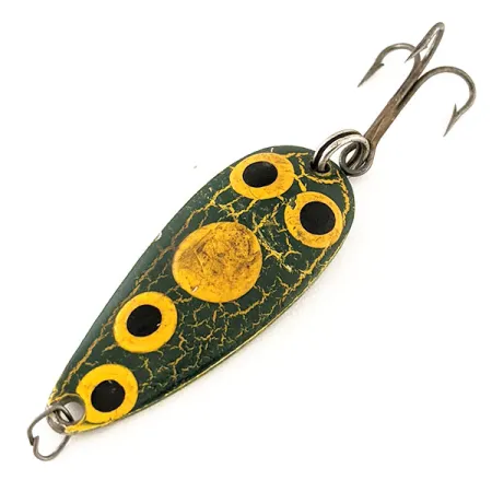 A striking green crackle finish defines the face of this 1 3/4" (4.5 cm) spoon, showcasing the sought-after Frog pattern. Eppinger's craftsmanship is on full display here with the Dardevle Spinnie, product code 12270. This model features a distinct concave design, a characteristic of the brand since Lou Eppinger began hand-making lures in Detroit. The visual appeal comes from large yellow circles with black centers, set against a web of yellow lines over a deep green base. Flipping the lure reveals a clean, silver-toned back stamped with "DARDEVLE SPINNE U.S.A.", confirming its Dearborn, Michigan roots. At a weight of 1/3 oz (9 g), it offers substantial mass for a lure of its dimensions. The hardware includes a treble hook and a split ring, both showing minimal wear. This specimen is beautifully preserved, warranting a condition rating of 5/5. The crispness of the lettering on the back provides a clear link to the manufacturing dies unique to the Eppinger facility.