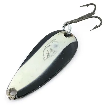 A bold white stripe against a deep black background defines the finish of this Eppinger classic. Measuring 1 1/2" (3.5 cm) and weighing 3/16 oz (6 g), this specimen is a prime example of the 15409 product line. The front surface features the familiar devil head logo stamped into the paint, while the reverse side is clearly marked "DARDEVLE MIDGET U.S.A." in clean lettering. This specific piece is in 4/5 condition, exhibiting minor signs of use such as small paint chips near the line tie and hook eyelet. Since Lou Eppinger began manufacturing these in Detroit around 1906, the proprietary dies have maintained the specific oblong, concave shape seen here. The hardware consists of a sturdy split ring and a sharp treble hook, suggesting it was well-cared for in a previous owner's tackle box. Because it features a nickel-colored back, it is particularly suited for clear water casting. The metal body provides enough weight for accurate placement even in light wind.