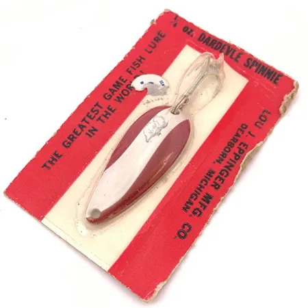 A striking red and white striped pattern characterizes the face of this vintage spoon, a color scheme that has remained a cornerstone of the manufacturer's lineup for decades. This Dardevle Spinnie was produced by the Lou J. Eppinger Mfg. Co. in Dearborn, Michigan, and carries the distinctive devil-head logo stamped directly into the metal near the line tie. Measuring 1 3/4" (4.5 cm) in length and weighing 1/4 oz (7.1 g) as indicated on the original packaging, the lure's teardrop shape is a familiar sight in North American tackle boxes. The specimen is cataloged under product code 3913 and is unused, still mounted on its authentic retail backing which details the company's historical Michigan roots (Condition 6). Its construction features a concave metal body designed for casting and a sharp treble hook attached via a split ring at the rear. The metal finish is bright and shows no signs of field use, maintaining the integrity of the paint and the silver-toned underside.