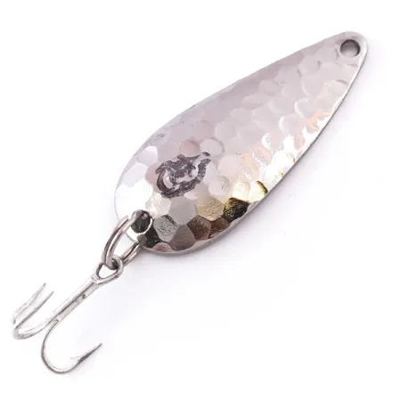 Hammered nickel plating gives this vintage spoon a classic, light-reflecting texture. Measuring 1 3/4" (4.5 cm) and weighing 1/3 oz (9 g), this specimen is a prime example of the Eppinger company’s legacy. The front face features the iconic black devil head logo, while the back is deeply stamped with "DARDEVLE SPINNIE DEARBORN MICH.", placing its production in the post-1959 era following the brand's move from Detroit. This lure, cataloged as product code 3999, is unused and retains its original luster across the entire metal surface. It comes rigged with a sturdy split ring and a sharp treble hook, designed for reliable casting toward trout or panfish. The concave teardrop shape and weight distribution of this Michigan-made lure are engineered for achieving distance and precision during the cast.