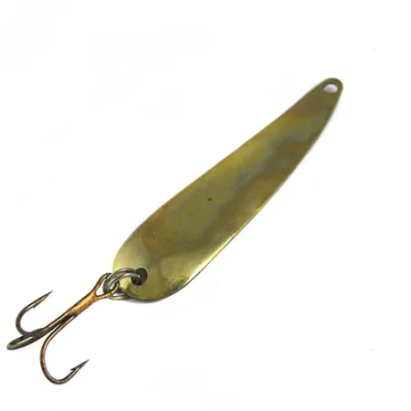 Weighing exactly 2/5oz (11g), this specimen highlights the slender profile that gave the ThinDevle its name. Eppinger, which began in Lou Eppinger’s Detroit basement back in 1906, used proprietary dies to stamp this specific concave shape, a design choice that persists even after the company’s 1959 move to Dearborn. This brass-colored lure, identified by product code 0563, measures 3 1/4" (8cm) from tip to bend. The surface retains a clean metallic glow with minimal marks, earning it a condition rating of 4/5. You'll notice the original hardware, including the sturdy treble hook and split ring, remains intact. These spoons were so trusted for their reliability that they were even included in military aviation survival kits during wartime. The line tie at the tapered end is clear and ready for a snap swivel or direct connection.