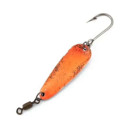 Sporting a vibrant orange finish with dark, speckled texturing, this specimen represents a classic piece of American trolling history from the Dick Nite Spoons catalog. Measuring 1 1/2" (3.5cm) in length and weighing a light 1/16oz (1.7g), the #2 model is a staple for anglers working freshwater depths for trout and salmon. The top side carries a bright, high-visibility orange coating, while the underside remains a polished silver-tone. Secured with its original hardware, the lure features a barrel swivel and a single hook, both showing the character of its 3/5 condition rating. This Dick Nite #2 (Product Code 14880) is built on a thin-gauge metal platform typical of high-quality trolling spoons manufactured in the USA. The paint shows authentic wear around the eyelets and edges, revealing the underlying material.
