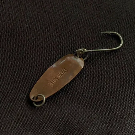 Stamped with the "DICK NITE" name across its concave surface, this copper-colored spoon is a quintessential example of American-made tackle from Washington state. Weighing a mere 1/32 oz (1 g) and measuring 1" (2.5 cm) in length, it is built for ultra-light applications where a small profile is necessary. The solid copper finish offers a distinct, earthy glint that differs from high-flash chrome or silver plating. For hardware, it features a single, large-gap siwash-style hook connected by a split ring, a configuration often preferred by those targeting trout or kokanee in moving water. A secondary split ring at the nose provides a reliable connection point for light leaders or swivels. Identified by product code 22940, the spoon is in 4/5 condition, showing well-preserved metal surfaces and strong attachment points.
