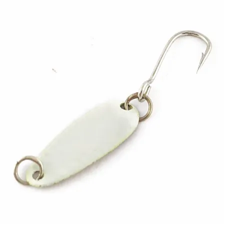 Pearl white finishes on ultra-light spoons weighing 1/64 oz (0.6 g) have been a secret weapon for Pacific Northwest anglers for decades. Manufactured in the USA, Dick Nite Spoons utilize a thin-bladed metal construction that creates a distinct presentation in the water despite the small profile. This 0 3/4" (2 cm) specimen, identified by product code 24312, displays a clean pearl coating across its surface. The lure is rigged with a single sharp hook and sturdy split rings, maintaining a condition rating of 5/5. Often utilized for trolling behind a dodger for kokanee, the lightweight design is also effective for stream fishing or vertical jigging during ice fishing sessions for various species like trout and panfish.
