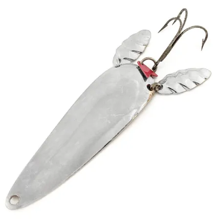 Stamped clearly on the reverse side with the "DOMINION" name and model "92," this Canadian-made piece is a testament to the longevity of Dominion Tackle, which began its journey in 1925. The polished nickel finish reflects light across a 3 1/4" (8 cm) body, which is uniquely flanked by two textured side fins. These wings are permanently attached, giving the 3/4 oz (21 g) spoon a distinct silhouette designed for casting or trolling. A vibrant red plastic attractor is positioned at the rear split ring, sitting just above the sturdy treble hook to draw focus. Every aspect of this specimen, from the clean stamping to the bright metal surface, remains in 5/5 condition. Identifying this particular item is made simple with product code 13070. The tapered nose features a single, clean line tie hole, completing a build intended for traditional hardware setups.