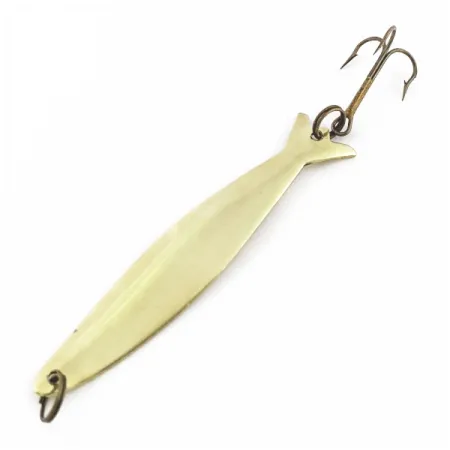 Eagle Tool. The bait is new without packaging. Solid brass gives this 2 3/4" (7 cm) spoon a natural flash that stays effective under various light conditions. Weighing exactly 3/16 oz (6 g), the slim profile allows for precise casting into tight spots or along weed edges. Eagle Tool Inc. manufactured this model with a distinct fish-tail stamp, identified by code 24582. Having never been fished, the metal remains in unused condition with a rating of 6, displaying its original factory luster. The stamped body is shaped for stability during steady retrieves or vertical presentations. Its natural brass color provides a muted reflection that often proves more effective than bright finishes in clear water environments. A single treble hook is positioned at the rear of the tapered body to balance the weight distribution.