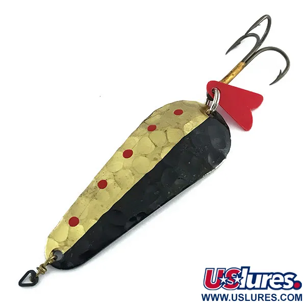 Hand-hammered brass provides a unique texture to this Swiss-made spoon, catching the light in a way only a craftsman’s tool can achieve. Weighing 1/2oz (14g) and measuring 2 1/4" (6cm), this EGB specimen (Product Code 9024) features a striking dual-finish aesthetic. One face displays a dimpled gold surface accented by five neat red dots and a bold black stripe running the length of the body. Flipping it over reveals a contrasting silver-plated side, also marked with that same dark stripe, showcasing the traditional EGB craftsmanship. A red plastic heart-shaped flipper is attached to the treble hook, adding a splash of color and visual resistance behind the spoon. The hook itself features a gold-tone shank, and a small swivel is pre-rigged to the line-tie eyelet to manage line twist during casting or trolling. The lure is in excellent condition (5/5), showing very minimal signs of age on the silver plating and original hardware. Manufactured in Switzerland, these lures are highly regarded among trout and salmon anglers for their solid brass construction and artisanal production methods.