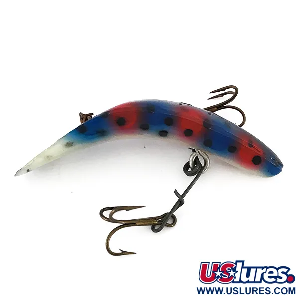 Trout-inspired colors define the finish on this Yakima Bait creation, blending deep blues and reds over a cream-colored underside accented by dark spots. Carrying the product code 7822, this FlatFish F7 is a well-maintained specimen with a 5/5 condition rating, showing a clean body and intact hardware. The signature banana-shaped profile measures 2 1/4" (6 cm) and features the traditional wire spreader harness equipped with two treble hooks. Weighing in at 1/8 oz (3.6 g), it is specifically designed for slow-trolling or light casting techniques where a steady, rhythmic retrieve is required to engage predatory species like trout or walleye. The manufacturer's "FLATFISH" stamp remains sharp and legible near the tail, and the nose-mounted wire line tie is securely seated.