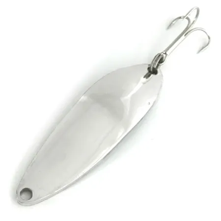 A polished Nickel finish defines the exterior of this Gator casting spoon, which measures 3 1/4" (8.5 cm) from tip to tail. Identified by product code 7021, the lure is stamped with the "GATOR" name directly into the metal body. These lures have been a staple for anglers since the Gator company was founded in the USA back in 1976, specifically choosing 304 stainless steel for its longevity and resistance to the elements. The 1 1/4 oz (35g) weight makes it a versatile choice for reaching deeper water columns through trolling or long-range casting. At the rear, a robust split ring secures a sharp treble hook, while the nose features a simple, precisely drilled eyelet for line attachment. This specimen shows a very clean surface and is rated at a condition of 5/5.