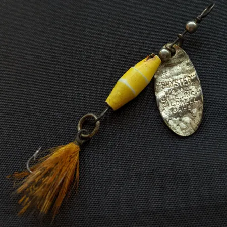 Weighing in at 1/8 oz (4 g), this classic inline spinner is a genuine piece of Idaho angling history. The "Crystal" color pattern is defined by a vibrant yellow body with a single white stripe, complemented by an oval silver blade. Measuring 2 1/4" (6 cm), the design incorporates an offset wire loop, a signature characteristic of the original Glen Evans models produced before the brand was acquired by Luhr Jensen. The blade carries a clear stamp reading "SHYSTER 1/8 OZ G.E. INC CALDWELL IDAHO," identifying its vintage pedigree. With a condition rating of 4/5, the lure shows gentle signs of aging on the metal surfaces and the brown feathered treble hook, preserving its authentic character. Built for versatility, the Shyster is configured to operate effectively at very slow retrieves in both still and flowing waters. The wire form remains straight, and the metallic beads are securely seated above the weighted body.