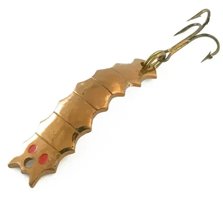 Segmented copper scales define the body of this unique larva-style spoon, crafted in the USA. The Al's Goldfish Helgy, product code 6650, features a curved profile designed to mimic aquatic insects. At 1 3/4" (4.5cm) in length, the metal body exhibits deep copper tones accented by two distinct red dots near the line tie. Weighing 3/16oz (5.5g), this specimen is a prime example of American tackle manufacturing, designed primarily for casting in streams or smaller bodies of water. The hardware remains in top form, featuring a sturdy split ring that connects a classic bronze-finished treble hook. This lure is in 5/5 condition, showing a bright, even finish across its ridged surface.