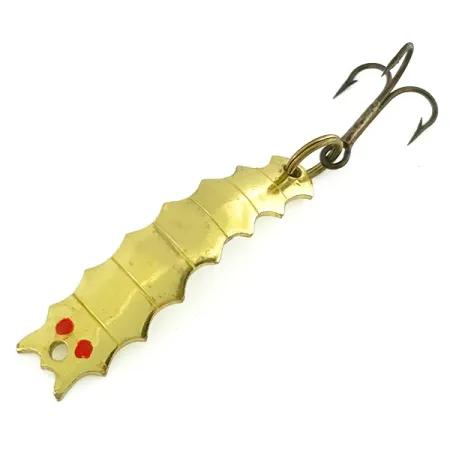 Segmented along its length to mimic the larval form of a hellgrammite, this vintage brass-toned metal spoon is a unique piece of American tackle history. Al's Goldfish produced this Goldfish Helgy, identified by product code 7244, with a distinctively curved and notched profile. Measuring 1 3/4" (4.5cm), the lure features two hand-painted red dots at the head that serve as eyes, sitting just above the forward line tie. The back of the body is clearly stamped with "GOLDFISH HELGY," maintaining the clean typography typical of the brand's mid-century manufacturing in the USA. Weighing in at 3/16oz (4.5g), this specimen is in 5/5 condition, showing a bright, reflective surface. The hardware consists of a single bronze-finished treble hook attached via a split ring at the tail, ready for casting in rocky streams or ponds.