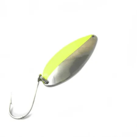 Nickel plating paired with a vibrant green stripe defines the aesthetic of this vintage American spoon. Measuring 2 1/4" (5.5cm) and weighing in at 2/5oz (11g), this Great Lakes Lures model (Product Code 0435) is a classic example of USA-made craftsmanship. The construction features a stamped metal body with a polished nickel underside, while the topside is divided between the bare metal and a bright green painted section. This specimen shows a well-preserved finish, earning a solid 4/5 condition rating, with only light surface marks visible on the reflective surfaces. The single hook is securely attached via a heavy-duty split ring at the tail, intended for casting or trolling in open waters. This dual-tone finish provides a distinct visual contrast between the high-flash nickel and the visibility of the green accent.
