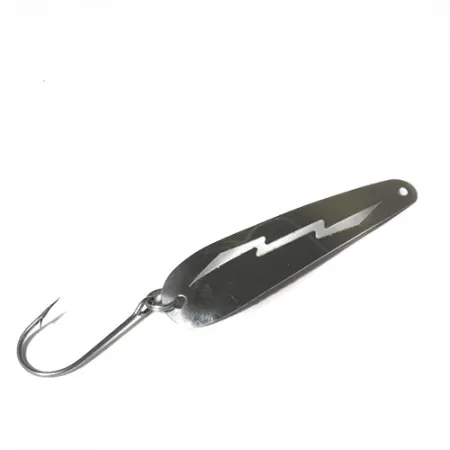 Measuring 3 1/4" (8 cm) in length, this USA-made Great Lakes Lures trolling spoon is part of the brand’s specialized Great Lakes series. A weight of 3/16 oz (5 g) makes it a nimble choice for varied trolling speeds. One side features a sharp lightning bolt motif, while the reverse displays a diagonal red glitter stripe and a bold chartreuse eye. This specimen carries product code 0479 and remains in great shape with a 4/5 condition rating, showing a bright nickel finish across the body. The lure is finished with a single hook mounted on a sturdy split ring, a setup favored for its strength and reliability during a strike.