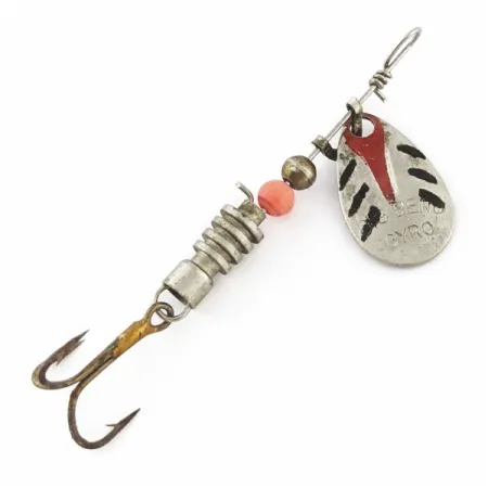 Stamped clearly on the silver willow-style blade is the "BIG BEND GYRO" identifier, a hallmark of this vintage Japanese-made rarity. Measuring 2 1/4" (5.5cm) in length and weighing a delicate 3/32oz (2.5g), this lure represents the detailed craftsmanship found in mid-century Japanese exports. The body construction consists of a ribbed metal stack, accented by a single bright orange bead and a silver spherical spacer that allows the blade assembly to rotate freely on the wire shaft. Hand-applied black slash marks and a bold red chevron decorate the blade, adding visual contrast to the polished metal. This specimen, identified by product code 24391, comes equipped with its original treble hook and remains in exceptional 5/5 condition, showing well-preserved paint and hardware. The wire form concludes with a traditional hand-wrapped eyelet, a common structural feature for light-tackle spinners of this period.
