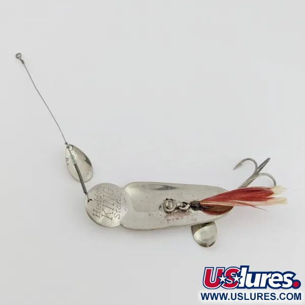 A distinctive red and white feather trailer accents the trailing treble hook of this vintage metal lure. Specialized as a spinner and spoon combination, the King Stanley from Heddon features a nickel-plated finish. Measuring 2 3/4" (7 cm) in length and weighing 3/4 oz (21 g), the main spoon body is clearly stamped with the manufacturer and model name near the head. An overhead wire frame carries a willow-leaf spinner blade held in position by metal beads and a tension coil. With a condition rating of 4/5, the nickel surfaces display minor surface wear and light oxidation consistent with age. This specific item is identified by Product Code 24499. The feathered dressing is secured directly to the shank of the rear hook to contrast with the rigid metal frame.