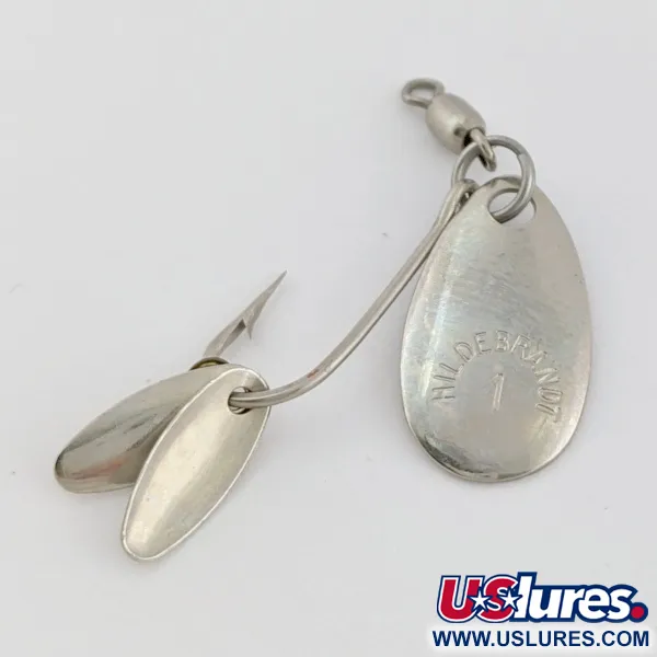 Nickel plating covers every surface of this compact 1/32 oz (1 g) frame. Stamped with the "HILDEBRANDT 1" identification, the primary teardrop blade is paired with two smaller blades positioned near the hook point to maximize flash. This Hildebrandt Spinners model 24526 measures just 3/4" (2 cm) in length, built around a single hook integrated with a barrel swivel at the head. Every metal component retains a high-sheen finish, earning a 5/5 condition rating for its clarity and lack of surface wear. The assembly uses a direct-to-shank mounting for the flicker blade, a design focused on ultralight casting or drifting techniques.