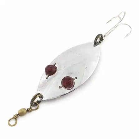 Red glass eyes stand out as the defining feature of this metal spoon, acting as a visual target for predators during the slow retrieve often required for pike in summer heat. Measuring 3" (7.5 cm) and weighing 1 oz (25 g), the silver-plated body is stamped with the Hofschneider name and the Rochester, N.Y. address. The two red beads are anchored through the blank, capturing light to mimic a wounded baitfish against the bright silver finish. On the reverse side, the stamping includes Patent No. 1,847,397. This specific instance is graded in 4/5 condition, exhibiting a clean reflective surface and original hardware. The spoon comes equipped with a tail-mounted treble hook and a swivel at the nose for line management. Product Code 24579.