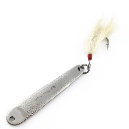 Forging a reputation for distance, the 3 oz (82g) weight of this Hopkins jig allows for substantial casting reach in heavy surf or deep water. A distinctive hammered texture covers the nickel body, designed to catch and reflect light much like a fleeing baitfish. The single hook is adorned with a classic white bucktail trailer, secured with a neat red thread wrap that provides a subtle focal point. Clearly stamped onto the metal surface is the "HOPKINS NO-EQL 4H" branding, marking its place in the lineage established by R.L. Hopkins in 1949 to withstand the corrosive demands of saltwater environments. This specific specimen is in excellent shape, showing a condition of 5/5 with a clean, reflective finish. Measuring 4 1/2" (11.5cm), the solid metal construction makes it a versatile tool for vertical jigging or trolling. Its catalog entry is designated by product code 23296.