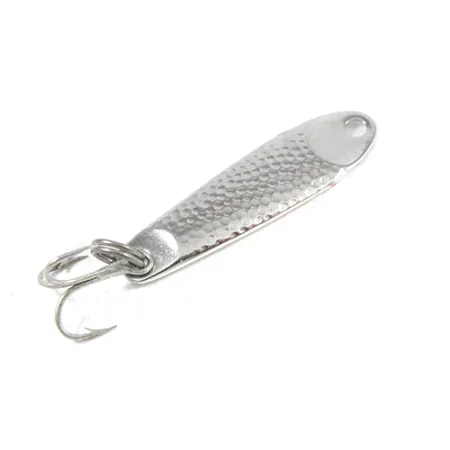 Nickel plating on this compact hammered body provides high-reflectivity when targeting fish in various light conditions. Identified as the Hopkins S 1/2 with product code 2127, this jigging spoon weighs 1/8 oz (4 g) and measures 1 1/2" (3.5 cm). The dimpled texture across the metal surface is a signature design of Hopkins, intended to maximize flash during vertical jigging or casting presentations. American-made craftsmanship is evident in the solid build and the attachment of a single treble hook via a robust split ring. For the collector or angler, this specimen is in excellent shape, earning a condition rating of 5/5 with its bright finish and clean hardware. A precision-drilled hole at the tapered end facilitates easy rigging for direct line ties or the addition of a snap.