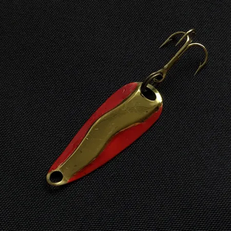 Weighing in at a mere 3/64 oz (1.3 g), this compact spoon represents the classic Luhr Jensen design for finesse applications. The 1 1/4" (3 cm) body displays a bright nickel base accented with bold red paint, a color combination identified by product code 21748. Produced in the USA, the metal maintains a high reflective quality, paired with a sharp treble hook attached to the rear eyelet via a split ring. This specimen earns a 5/5 condition rating, showing very little wear on the painted surfaces or the metallic plating. The holes at the head and tail are cleanly punched, ensuring a secure connection for the line and hardware during light-tackle casting or trolling sessions.