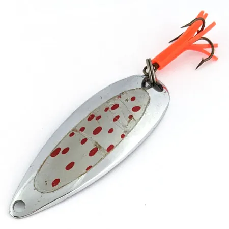 Stamped clearly into the nickel-plated surface of the back, the Hurricane name identifies this classic spoon as an American-made original. A textured silver insert decorated with small red dots covers the center of the front face, providing a distinct visual break against the polished nickel body. Measuring 2 1/2" (6.5 cm) and weighing 2/5 oz (12.5 g), this lure carries product code 19038 and represents a solid example of mid-century USA manufacturing. The hardware consists of a treble hook accented by a vibrant orange rubber trailer, adding a splash of high-visibility color to the tail end. Rated 5/5, the specimen remains in beautiful shape, with the stamped branding and the adhesive on the decorative insert both well-preserved. The line-tie and hook-attachment holes are precisely centered through the metal body, which is designed for casting or trolling in various water conditions.