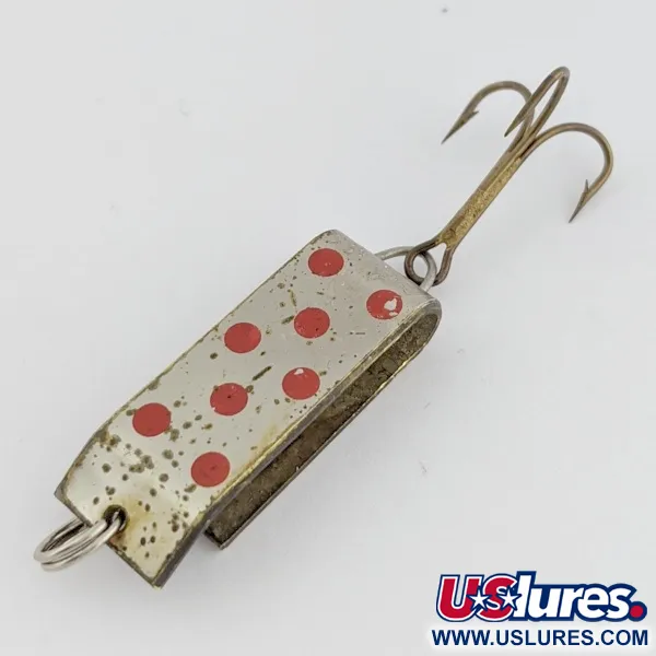 Bright red dots over a nickel-plated finish provide a high-contrast visual for this 1 1/2" (3.5 cm) metal lure. Jake's Lures designed the Lil Jake with a distinctive folded rectangular body that functions as a hybrid between a traditional spoon and a spinner. This 1/3 oz (9 g) specimen, identified by product code 24520, features a wider and shorter profile than standard spoons to maintain its presence during slow retrieves or trolling. The dual-action construction is intended to produce both flash and vibration, a combination often used for trout and salmon in clear water. With a condition rating of 4/5, the stamped metal surfaces remain bright with well-preserved red paint. The line tie is positioned at the top ring, while a wire loop secures the treble hook at the base.
