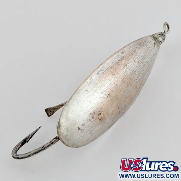 Real silver plating gives this 2 1/4" (5.5 cm) spoon a bright, white flash that stands out significantly from modern chrome or polished steel finishes. Stamped from a heavy copper and zinc alloy, the body is engineered with a thicker center to maintain a stable hook-up orientation during the retrieve. A single fixed hook is protected by a sturdy metal wire weed guard, allowing for effective casting directly into heavy vegetation and lily pads. Unlike contemporary versions, this particular specimen comes from the older United States production stock and bears the classic manufacturer stamps on the interior surface. Showing light, honest signs of age that do not diminish its reflective properties, the lure is in 4/5 condition. At a weight of 1/3 oz (9 g), the design helps eliminate line twist and provides enough heft for accurate placement in tight pockets of cover. This vintage Johnson Silver Minnow Weedless is cataloged under product code 24492.