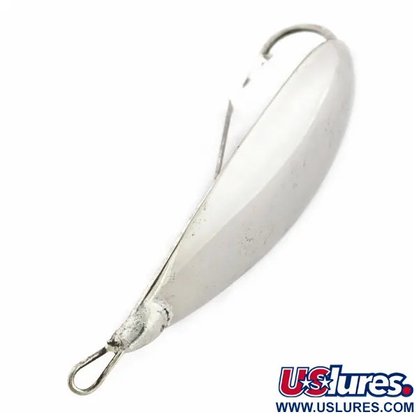 Stamped from a copper and zinc alloy, this spoon features a distinct thickness in the center that helps maintain an upright position during the retrieve. This particular Johnson Silver Minnow Weedless, finished in a bright nickel plating, carries a 5/5 condition rating indicating it is exceptionally well-preserved. Weighing 2/5 oz (12 g) and measuring 2 1/4" (6 cm), the lure includes the signature wire weed guard designed to navigate heavy cover without snagging. Unlike modern iterations, this specific piece #24548 originates from the classic USA production era. The wide spoon body is engineered to produce a 270-degree wobble, throwing flashes downward and to the sides where predators are most likely to strike. This design helps minimize line twist by maintaining a stable, rhythmic motion in the water. Often paired with a pork rind trailer for added visual appeal, the spoon’s movement remains consistent even when tipped with extra bulk. The hook is integrated directly into the body to ensure it stays point-up, effectively mimicking the profile of a small baitfish weaving through lily pads or grass.
