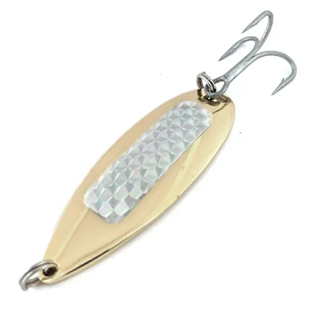 A polished gold finish provides the primary visual draw for this Johnson Sprite, a classic casting spoon that measures 3 1/4" (8.5 cm) in length. Weighed at 1 1/4 oz (35 g), the lure's heavy profile is a hallmark of the original production runs from the USA, distinguishing it from newer versions currently made elsewhere. The center of the spoon features a textured silver holographic tape insert, which adds a distinct multidimensional flash to the gold body. Recorded under Product Code 13648, this piece is equipped with a large treble hook and split rings that remain in excellent condition. A rating of 5/5 reflects the quality of the specimen, which retains its luster across the entire stamped surface.