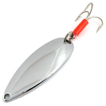 Polished nickel plating catches the light across the sleek profile of this classic American spoon. Weighing in at 3/5 oz (17 g) and measuring 2 3/4" (7 cm) in length, this specimen represents a golden era of manufacturing from the USA. The concave side features a distinct "JOHNSON'S SPRITE" stamp, showcasing the legacy of the brand. A characteristic red plastic tube is fitted over the shank of the treble hook, serving as a visual attractor. Cataloged as product code 15910, the lure maintains a 5/5 condition with a mirror-like finish and original hardware. This design is built for casting and remains a favorite for anglers targeting aggressive species in both freshwater and saltwater environments.