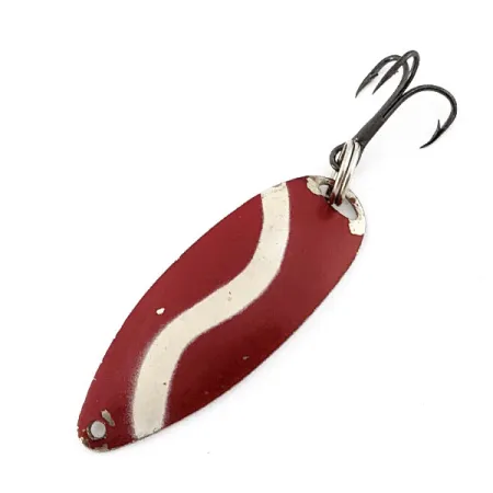 Red and white wavy stripes define the vibrant painted face of this 3/16 oz (4.5 g) spoon. Turning the lure over reveals a polished silver back deeply embossed with the "JOHNSON'S SPRITE" name, a signature element that reflects the Johnson brand's history of manufacturing durable metal lures. This specific model, identified by product code 22334, is preserved in 4/5 condition, exhibiting a clean finish and original hardware. The spoon features a single line-tie hole at the tapered nose and a robust split ring connecting a dark-finished treble hook at the trailing end. Its weighted teardrop profile and solid metal construction were specifically designed for casting and trolling techniques.