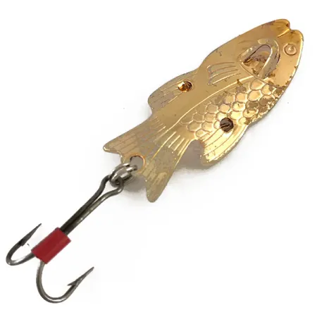 Stamped with the "KATCH KING PAT. P." mark, this 1/4 oz (7 g) metal spoon features a distinct fish silhouette in a bright Gold finish. This USA-made specimen from 1958 showcases a clever mechanical design where the 2" (5 cm) body is detailed with pressed scales and embossed gills. Cataloged under product code 4805, the construction includes two visible rivets and a "U" shaped cutout near the head that allows for various rigging styles. The hardware consists of a double hook attached via a wire fastener, marked by a vintage red sleeve on the shank, specifically designed to function as a weedless lure when navigating vegetation. The gold-plated surface exhibits slight, honest wear consistent with its 4/5 condition rating.