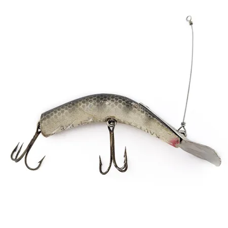 A weight of 1/4 oz (7 g) gives this wooden floating lure the density needed for accurate placement while maintaining the buoyancy characteristic of its material. Measuring 2 1/4" (6 cm) in length, the body features a meticulously applied grey and black scale pattern that transitions into a lighter belly, where the "Kautzky Deep Ike" branding remains legible. This specific model, product code 22633, is equipped with a prominent metal diving lip and an original wire leader, suggesting its purpose for deep-water presentations. The finish shows gentle signs of its history, resulting in a 4/5 condition rating that emphasizes its well-preserved nature and authentic look. Two sharp treble hooks are securely fastened to the wooden frame with original hardware. A splash of red paint near the throat provides a traditional visual accent against the metallic silver and grey tones of the main body.