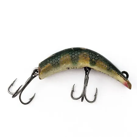 Measuring exactly 1 3/4 inches (4.5 cm), this Kautzky Lazy Ike showcases the classic curved wooden profile that became a staple in American tackle boxes. Carved from wood with a weight of 1/8 oz (3.5 g), the body features a dark green honeycomb scale pattern over a cream-colored belly. The hardware includes two treble hooks attached via screw-eyes, which was the standard assembly for these mid-century American-made lures (Product Code: 20544). With a condition rating of 4/5, the finish displays character through light wear on the nose and along the top ridge, revealing the natural wood grain beneath. A distinct touch of red paint remains on the tail section, a common visual attractor used by Kautzky during this era. The stamped name is partially visible on the underside, grounding this specimen in its historical USA manufacturing roots.