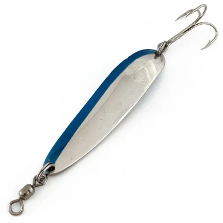 Heavy-gauge metal construction allows this Luhr Jensen Krocodile #4 to cast effectively into the wind. Identified by product code 15378, this 1/2 oz (14 g) spoon measures 2 1/2" (6.5 cm) and features a high-visibility blue stripe along the flank of its nickel-plated body. On the reverse, the "LUHR JENSEN KROCODILE" stamp remains sharp and legible. The hardware configuration consists of a barrel swivel at the tie point and a treble hook at the rear, both secured by robust split rings. This specific color pattern, Nickel / Blue, is frequently favored by jetty anglers targeting salmon and trout in the Great Lakes. The lure presents in 5/5 condition, maintaining a brilliant reflective surface and original factory rigging. Its teardrop shape is a design hallmark of the series, intended for deep-water presentation and long-range accuracy.