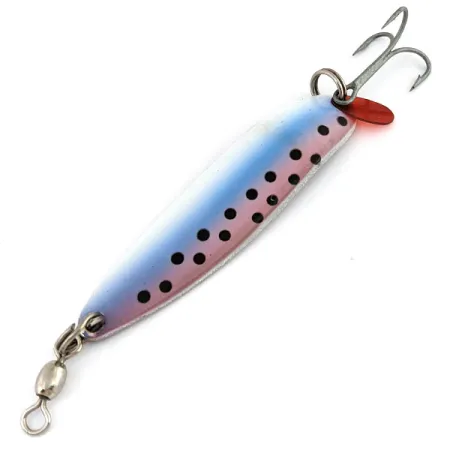 Stamped clearly on the reverse side with the Luhr Jensen and Hood River, Ore markings, this classic spoon remains a staple for those who need distance in their casting. The face showcases a rainbow trout-inspired color scheme, blending a blue spine into a soft pink-lavender flank, finished with prominent black dots over a bright silver base. Measuring 2 1/2" (6.5 cm) and weighing 1/2 oz (14 g), the narrow, thick-waisted body is designed for reaching into the water column or punching through wind during long-distance retrieves. At the rear, a small red plastic attractor tag is paired with a sharp treble hook, while the nose features a pre-installed barrel swivel to manage line twist. This specimen, identified by product code 15979, is in excellent condition, rating a 5/5 with its vibrant finish and clean hardware. The Made in USA stamp on the back confirms its heritage from the original Oregon manufacturing facility.