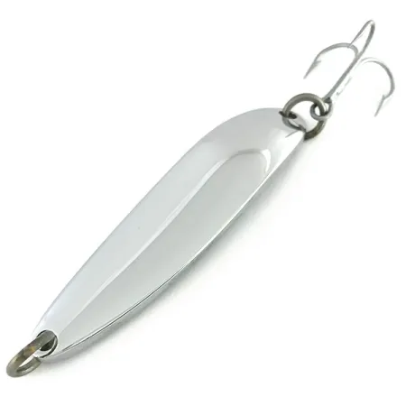Nickel plating on this 1/2oz (14g) spoon provides a high-flash mirror finish that remains exceptionally clean, earning a condition rating of 5/5. Measuring 2 1/2" (6.5cm), this Luhr Jensen Krocodile #4 carries the Product Code 16048 and is built for distance casting and reaching depth quickly. The hardware includes a secondary 'flipper' blade attached to the rear split ring alongside the treble hook, intended to provide extra flash. On the concave interior, the metal is clearly stamped with the name 'K.O. WOBBLER,' which makes for an interesting collector variation for this specific specimen. The heavy-gauge metal body is designed for a steady descent and maintains its orientation during both casting and trolling applications. Both the nose and tail split rings are securely fastened, with the treble hook retaining sharp points and a clean finish. This nickel finish is a classic choice for clear water, reflecting ambient light effectively at various depths.