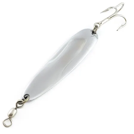Heavy nickel plating covers the entire 2 1/2" (6.5 cm) body of this specimen, providing a high-visibility mirror finish. Originating from the Hood River, Oregon facility, the reverse side of this Luhr Jensen Krocodile #4 features the distinct "DIE #4" stamp alongside the manufacturer's legacy markings. At a weight of 3/5oz (17g), the thick metal construction is designed for long-distance casting and trolling techniques. The hardware includes a factory-installed barrel swivel and a silver-toned treble hook, both maintaining their original integrity. This specific lure, carrying product code 22841, is in 5/5 condition with a bright, reflective surface across its contoured profile. Stamped details on the concave side confirm its USA heritage and the specific die number used during the manufacturing process.