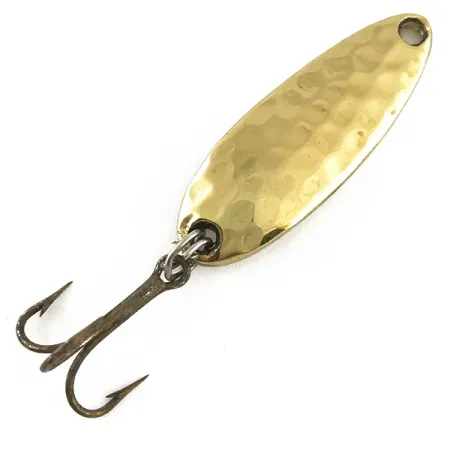 Hammered gold surfaces provide a distinctive texture on this 3/16 oz (6 g) Luhr Jensen classic, designed to catch light from multiple angles even in stained water. Measuring 1 1/2 inches (3.5 cm) in length, the Krocodile features the dense, narrow profile that makes it a favorite for reaching significant distance on the cast. On the smooth reverse side, the “LUHR JENSEN KROCODILE” stamp is cleanly impressed, identifying this piece as a vintage Oregon-made lure. The spoon is rigged with a factory split ring and a bronzed treble hook, showing only very minimal signs of age, which supports its 5/5 condition rating. Identified by product code 4264, the solid brass construction ensures it sinks quickly to the target zone when targeting trout or panfish. A single pre-drilled hole at the tapered end allows for easy connection to a snap or leader.