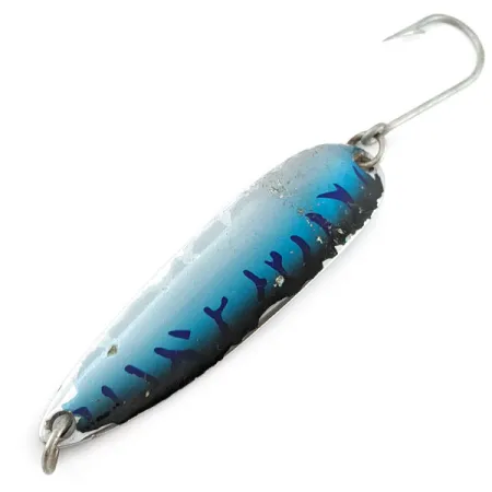 Deep blue mackerel scales decorate the top surface of this Luhr Jensen Krocodile #5, transitioning into a lighter pearlescent finish near the edges. Measuring 3 1/4" (8.5 cm) with a substantial 1 oz (28 g) weight, this spoon is specifically designed for high-density casting distance. Flipping the lure reveals the authentic 'KROCODILE' and 'LUHR JENSEN' identification stamped into the polished chrome back. Product code 20377 comes equipped with a single, heavy-duty hook, making it a reliable choice for targeting staging salmon or saltwater predators where a strong hookset is mandatory. This specimen maintains a 4/5 condition rating, showing light use while retaining the vibrance of its mackerel pattern and the high reflectivity of the metal plating. The narrow, thick-stamped body allows it to cut through crosswinds efficiently when casting from a jetty or pier.