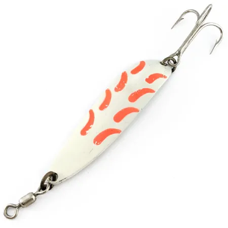 Weighing in at 1oz (28g), this heavy-gauge metal spoon remains one of the most versatile designs ever produced for both casting and trolling. The 3 1/4" (8.5cm) body of this Luhr Jensen Krocodile #5 features a distinct white/orange UV pattern on the face, designed to enhance visibility in deeper or stained water. Identified by product code 21107, this USA-made specimen comes equipped with original hardware, including a durable treble hook and a barrel swivel to prevent line twist. The reverse side maintains a high-polish chrome finish, providing a high-contrast flash against the painted front. Rated at a clean 5/5, the lure shows its original finish and hardware in excellent state. Its narrow, tapered shape is characteristic of the Krocodile line, allowing for deep-water presentations and long-distance deliveries.