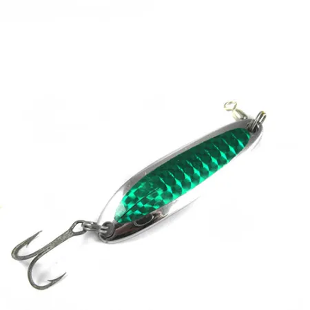 A striking green prismatic tape covers the front of this 2 1/4" (5.5 cm) nickel spoon, catching light at every angle. Weighing in at 1/3 oz (10 g), the Luhr Jensen Krocodile Die #3, identified by product code 0426, is engineered for the long-distance casting necessary to reach deep-staging fish. The reverse side features the classic embossed "KROCODILE" name along with its USA origin and size stamp indicating it was crafted in Hood River, Oregon. This specific specimen maintains a 5/5 condition, with the hardware and the green scale-patterned tape appearing remarkably fresh. Outfitted with a sturdy split ring and a sharp treble hook, the 0426 model is built to handle the heavy strikes of predatory species. Its narrow, weighted profile allows it to cut through wind and reach depths more efficiently than standard thin-metal spoons.