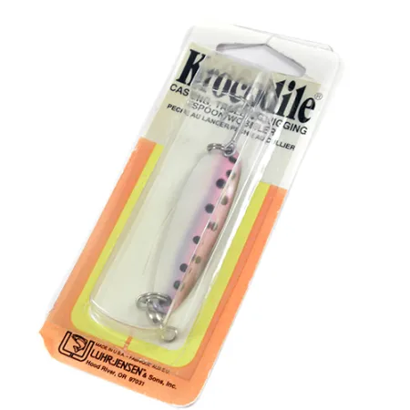 Nickel plating provides the foundational flash for this Rainbow Trout pattern, creating a high-contrast presentation for salmon or trout. This Luhr Jensen Krocodile Die #3 measures 2 1/4" (5.5 cm) in length and carries a weight of 1/3 oz (10 g), a profile optimized for both distance casting and controlled trolling. Identified by product code 2073, the spoon features a gradient of pink and silver hues with distinct black spots, accurately mimicking a juvenile trout. The specimen is unused and remains in its original vintage blister pack from the Luhr Jensen & Sons factory in Hood River, Oregon. Heavy-gauge metal construction supports a distinct wobble during retrieval, ensuring the lure maintains its presence even when targeting powerful game fish. Hardware includes a durable split ring and a sharp treble hook, hallmarks of the brand's reliability. The card includes the classic 'Made in USA' designation, marking it as a piece of American angling history.
