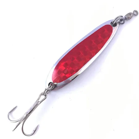 Nickel-plated surfaces provide the high-visibility flash for this Luhr Jensen Krocodile Die #3, a spoon favored for its utility in both fresh and saltwater. Measuring 2 1/4" (5.5 cm) and weighing 1/3 oz (10 g), the lure is built for long-distance casting and trolling applications. This specific unit, identified by product code 4049, is accented with a red prismatic honeycomb tape that creates a distinct light pattern compared to traditional paints. On the reverse side, the stamp clearly reads 'KROCODILE DIE #3 LUHR JENSEN HOOD RIVER, ORE', indicating its heritage from the brand's Oregon facilities. The hardware is comprised of a stout split ring and a sharp treble hook. With a condition rating of 5/5, the nickel body remains bright and the adhesive on the red inlay is secure at every edge. The lure's narrow profile and weight distribution allow it to hold its depth effectively when retrieved through heavy currents or deeper water columns.