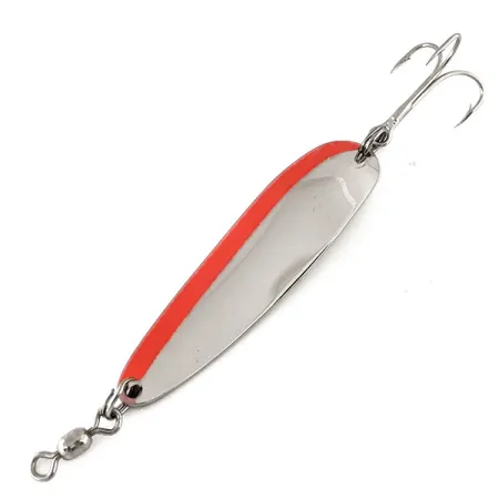 Weight of 1/2oz (14g) gives this Krocodile Die #4 the density needed to reach deep water where staging salmon often congregate. Measuring 2 1/2" (6.5cm), the lure features a high-polish Nickel / Red color scheme with a distinct fluorescent stripe along one flank for high visibility. On the reverse side, the metal is clearly stamped with the Luhr Jensen name and the Krocodile branding. This item, identified by product code 11177, is in 5/5 condition with a clean reflective surface and well-preserved factory hardware. Its thick-walled construction is designed to allow for long casts from jetties or boats, cutting through crosswinds effectively. According to technical data, the shape is engineered to produce a steady wobble during the retrieve, making it a reliable choice for casting, trolling, and even vertical jigging. It comes equipped with a top-mounted barrel swivel and a sharp tail treble hook.