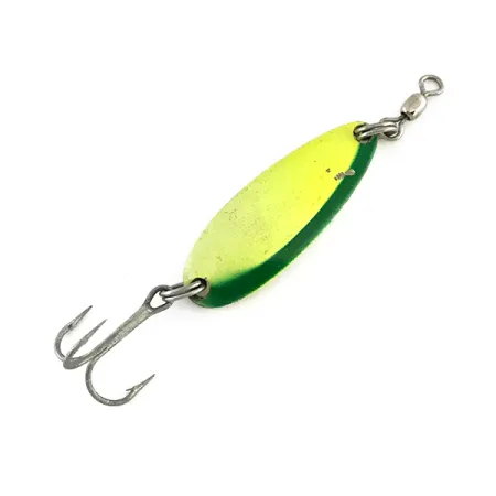 Dipped in a bold two-tone yellow and green finish, this 1/3 oz (9 g) metal spoon is a versatile staple for any casting or trolling setup. The 1 1/2" (4 cm) Krocodile UV by Luhr Jensen features a narrow, thick-stamped body that helps reach depth when targeting staging salmon or trout. A standout feature of this particular model, identified by product code 8112, is its specialized UV-reactive coating which illuminates under low-light conditions to increase visibility in stained water. The hardware is built for durability, featuring a stout treble hook and a top-mounted swivel to help manage line twist. This specimen is in 5/5 condition, appearing exceptionally clean and well-maintained. Its specific shape allows for a distinct wobble during the retrieve, performing well across a variety of speeds.